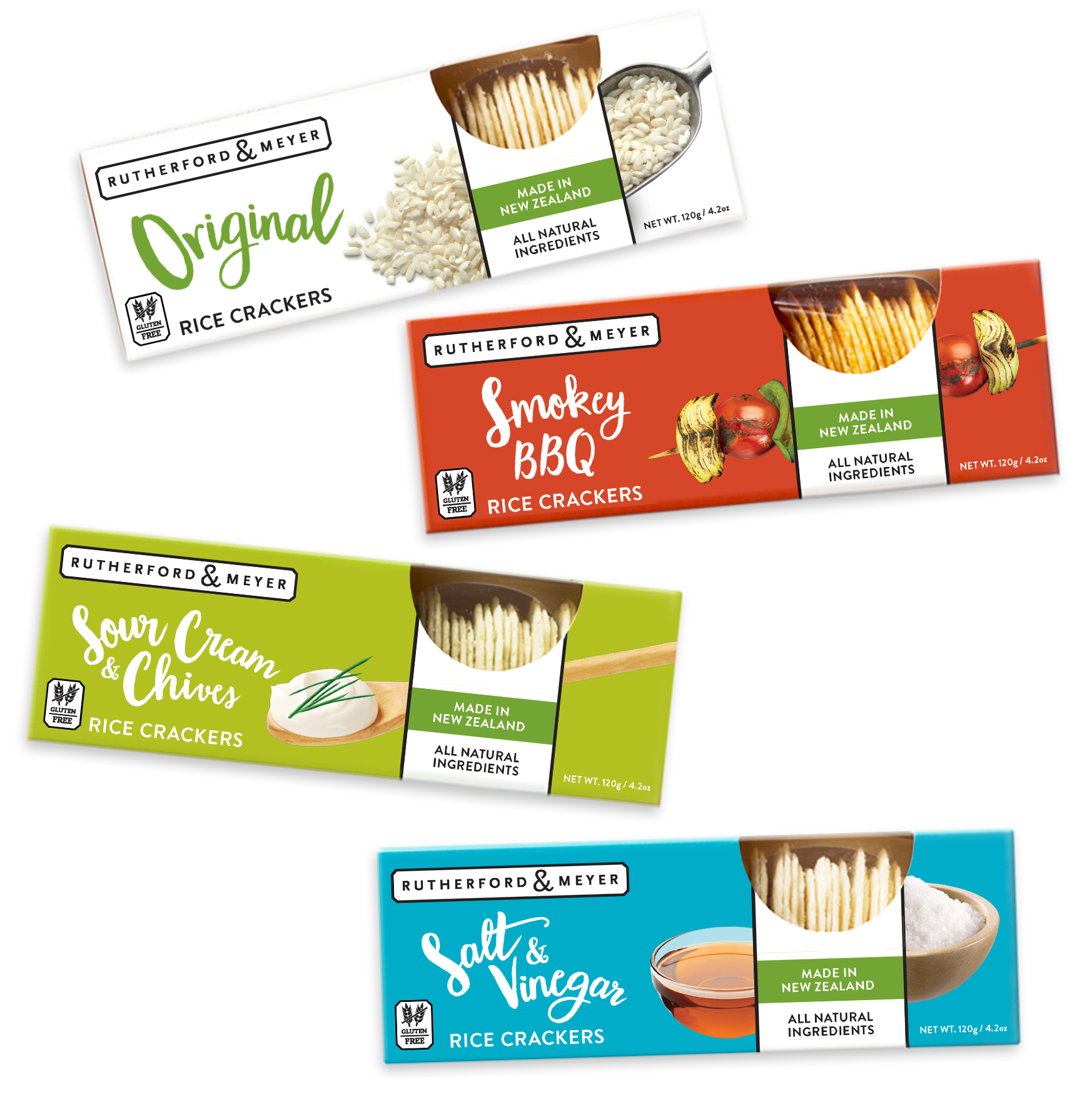 Rutherford & Meyer is a New Zealand based food manufacturer that specializes in gourmet crackers and fruit spreads to elevate your charcuterie board. With the launch of their rice crackers, Rutherford & Meyer approached Strong Studio with designing the packaging for the product line.